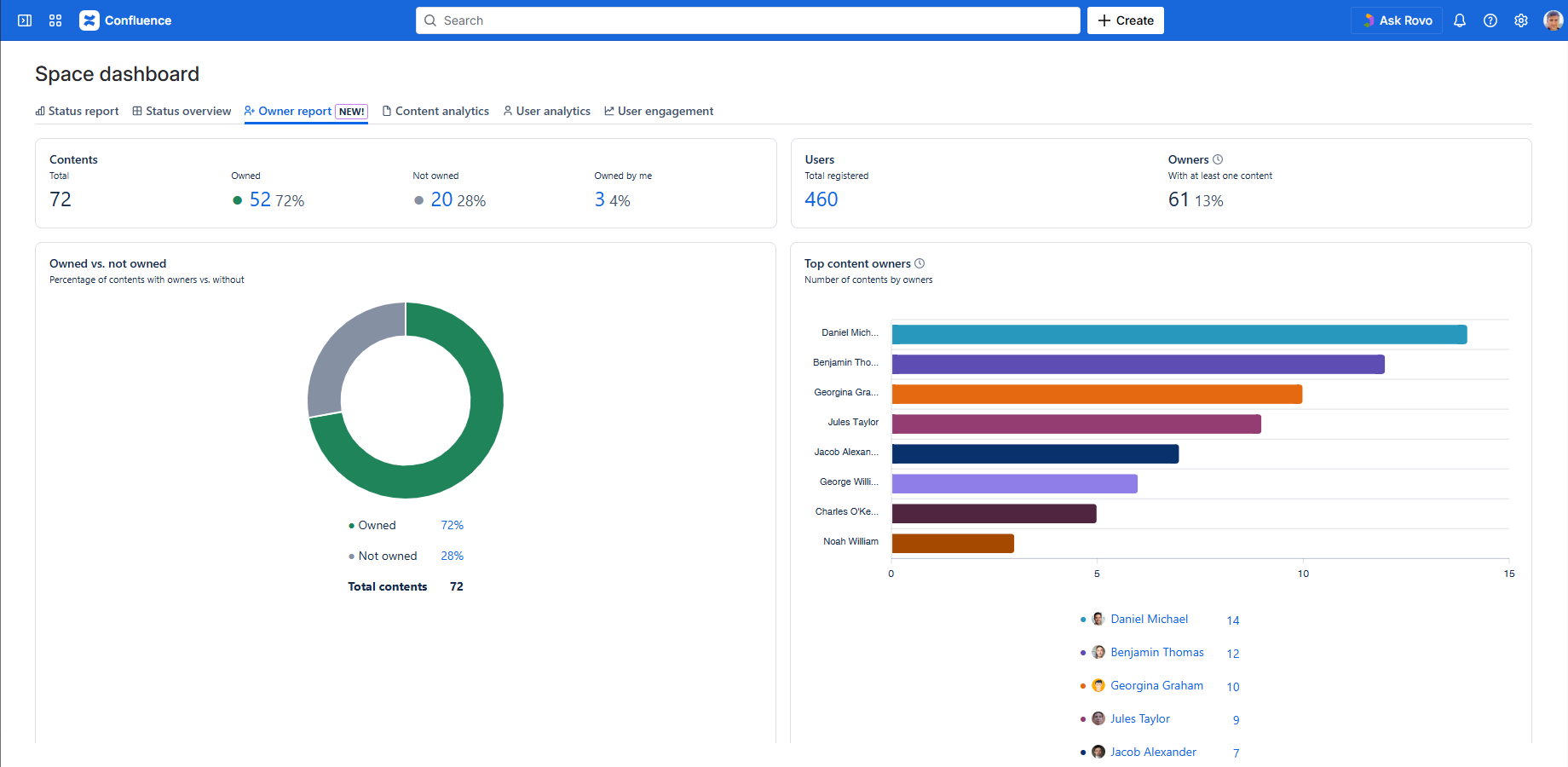 | Owned vs. not owned | The ring chart visualizes the proportion of content that has at least one owner versus content with no owner. You can click the percentage values to see the list of contents in that category. | Generally, a higher rate of owned contents indicates a healthier site or space. Consider assigning Confluence page owners to ensure every page is actively managed. |