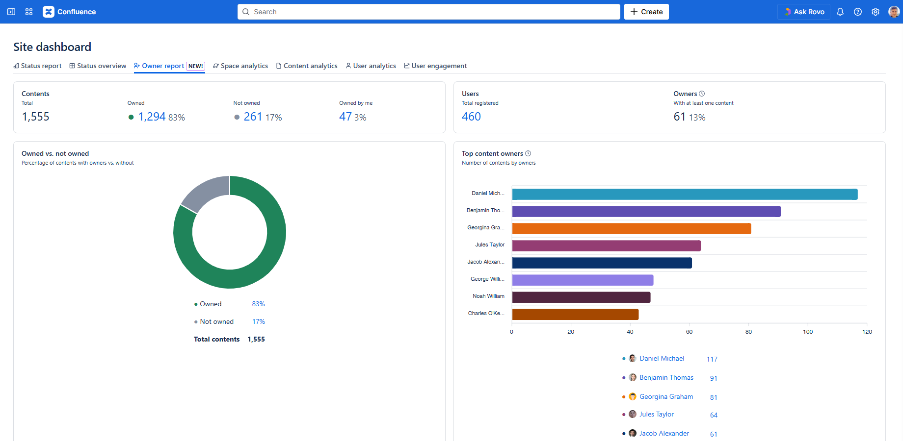 | Owned vs. not owned | The ring chart visualizes the proportion of content that has at least one owner versus content with no owner. You can click the percentage values to see the list of contents in that category. | Generally, a higher rate of owned contents indicates a healthier site or space. Consider assigning Confluence page owners to ensure every page is actively managed. |