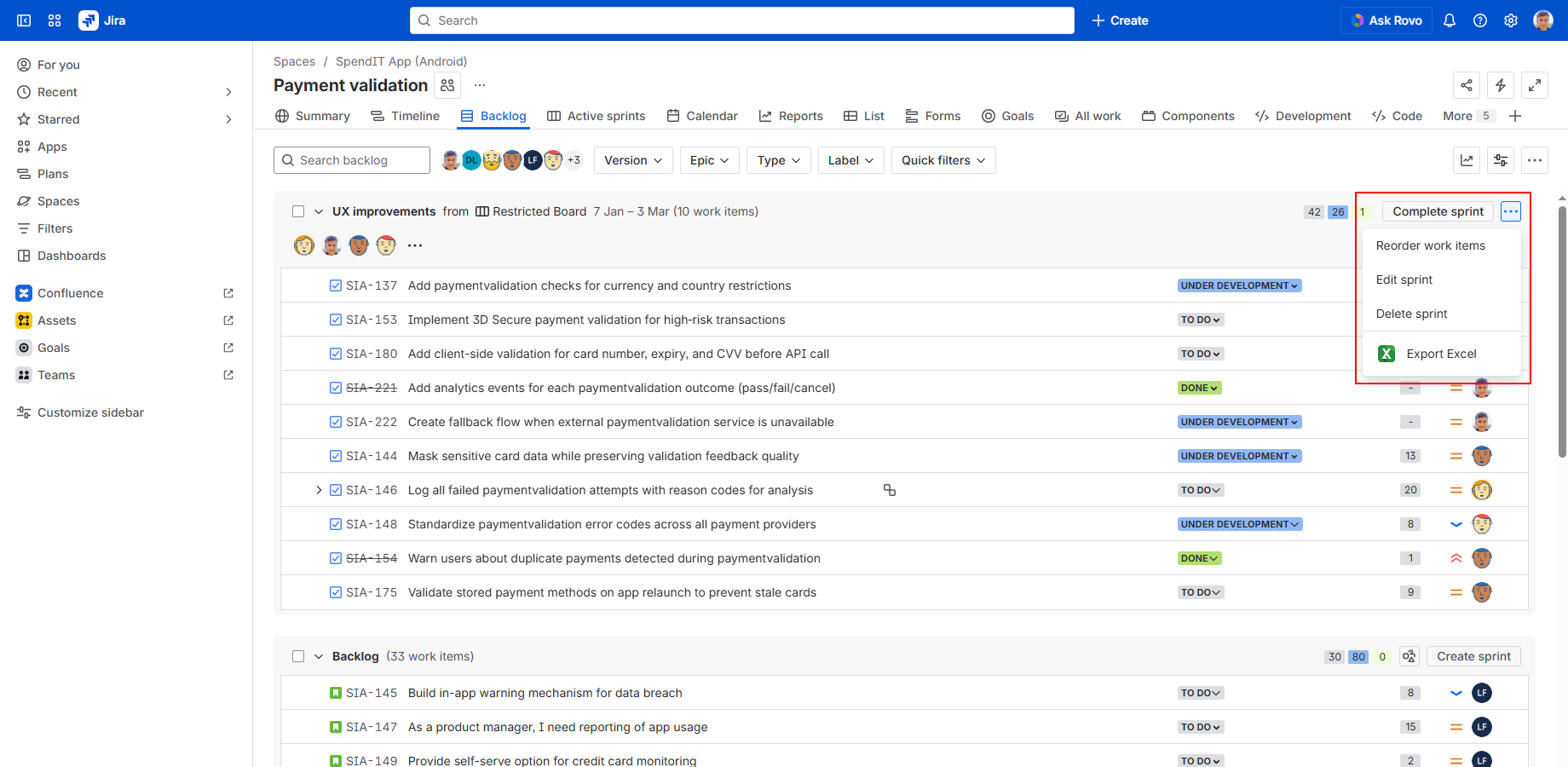 | "Export work items from a sprint" card on the Excel Export Center screen. | "..." menu → "Export Excel" at the sprint on the Backlog screen. |